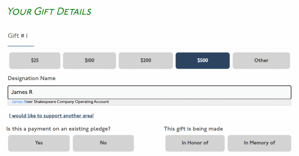 1. Make your way to https://advancement.cnu.edu/portal/give 2. Search “James River Shakespeare Operating Account” 3. Fill out the rest of the form, and click “Submit”